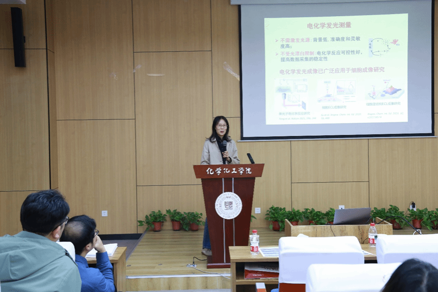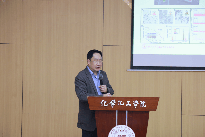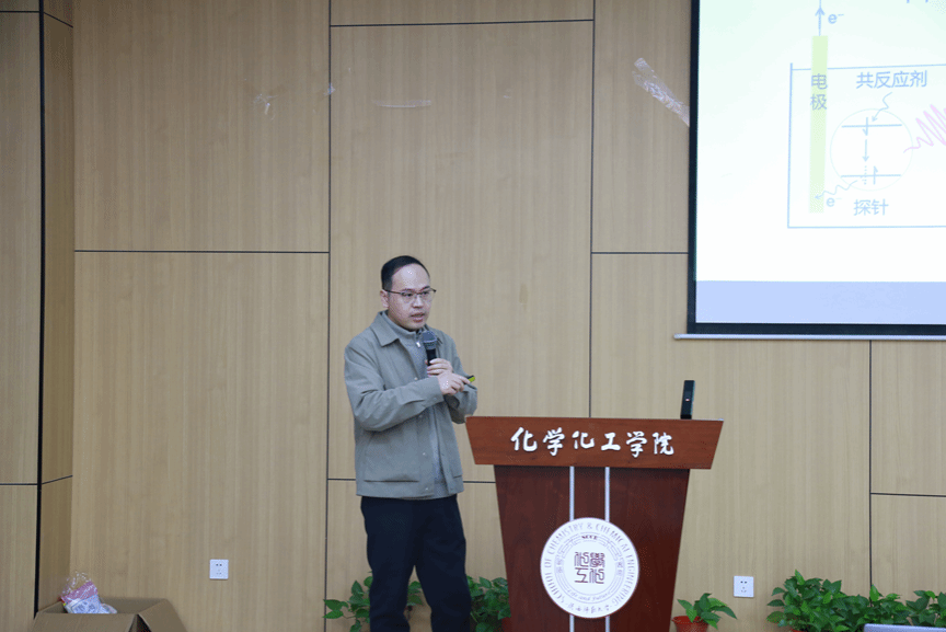会议开幕式由院长刘成辉教授主持并致欢迎词,代表学院热忱欢迎各位专家莅临指导交流,希望此次论坛能进一步推动我校化学学科的发展。中国科学技术大学崔华教授、厦门大学颜晓梅教授、四川大学吕弋教授、复旦大学刘宝红教授、西北师范大学李平教授、厦门大学朱志教授、南京大学叶德举教授、中科院杭州医学所韩达研究员、中国科学技术大学蒋杰副研究员、南京师范大学郭维亮教授分别从延迟的化学发光及其在体外诊断中的应用、纳米生物单颗粒水平多参数定量表征及其生物医学应用、基于稳定同位素标记的生物分析研究、电化学发光生物传感与单分子测量、基于氧化应激生物标志物的脑部荧光成像与诊疗研究、微流控生物定向进化及其应用、体内可控组装与分子诊疗、功能核酸从头设计、基于纳米孔道电化学的单分子时间组学和电化学发光显微成像与测量等不同角度做了精彩报告。内容丰富精彩,提问环节气氛热烈。